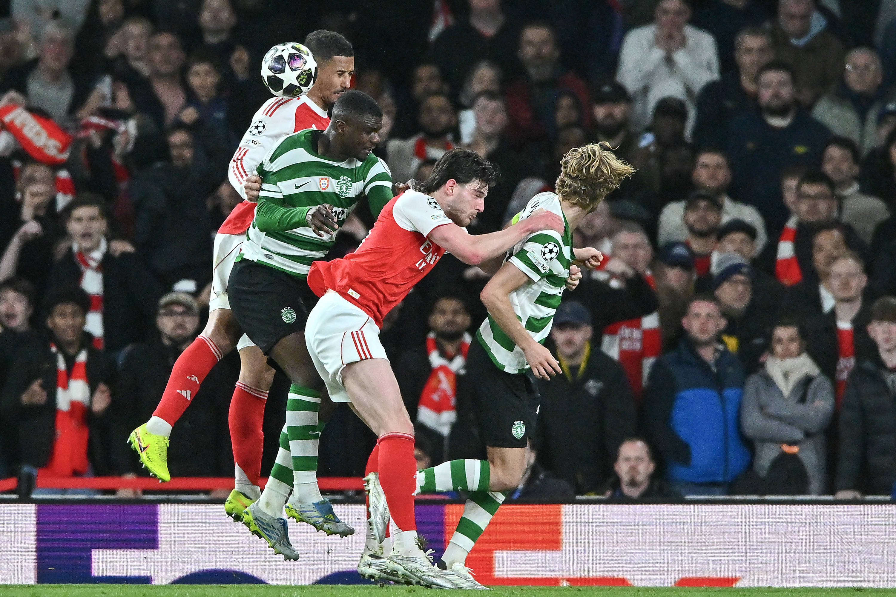 4月15日,阿森纳队球员赖斯(右二)、萨利巴(左一)与葡萄牙体育队球员特林康(右一)、迪奥曼德争顶。 新华社发