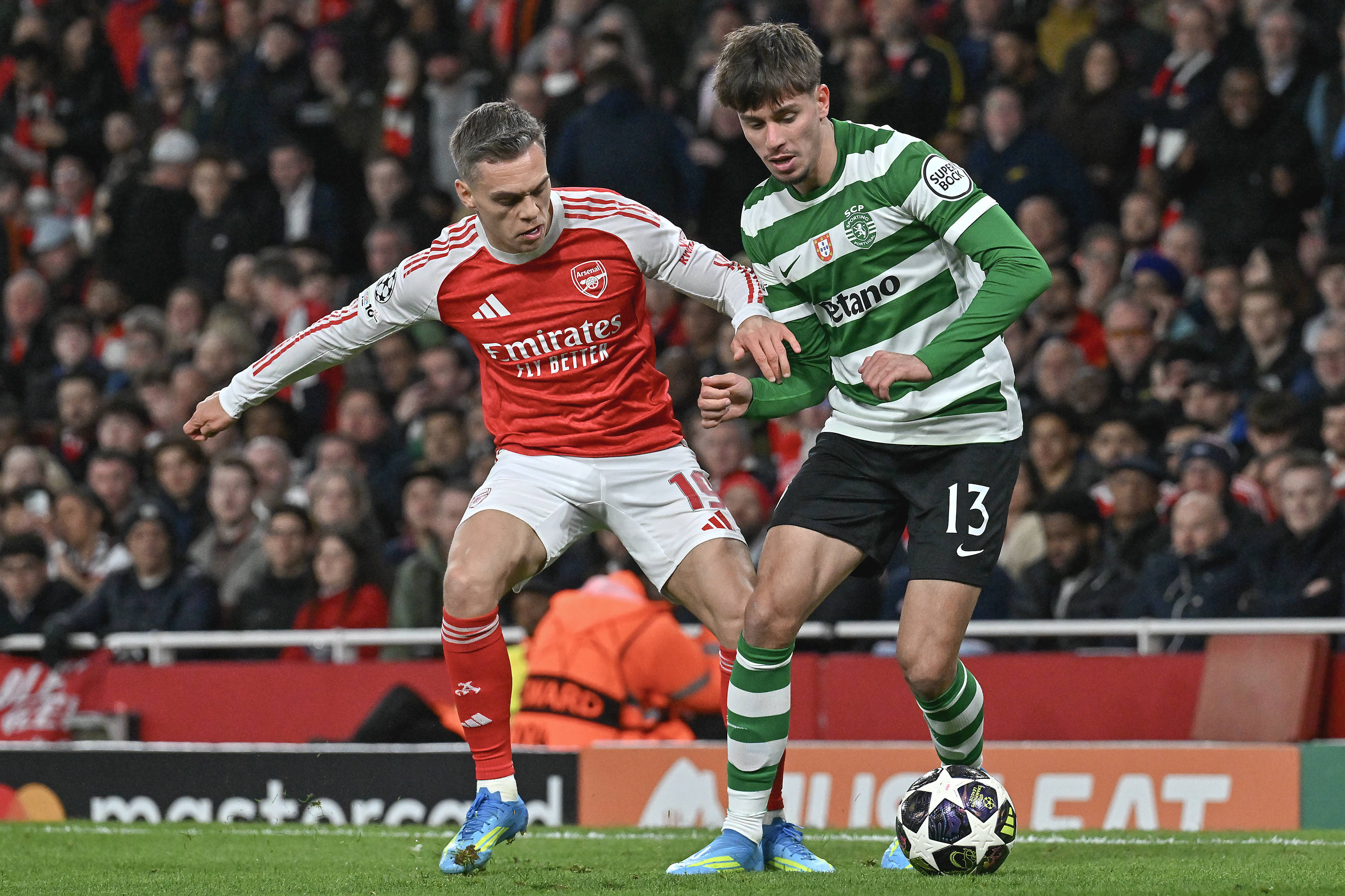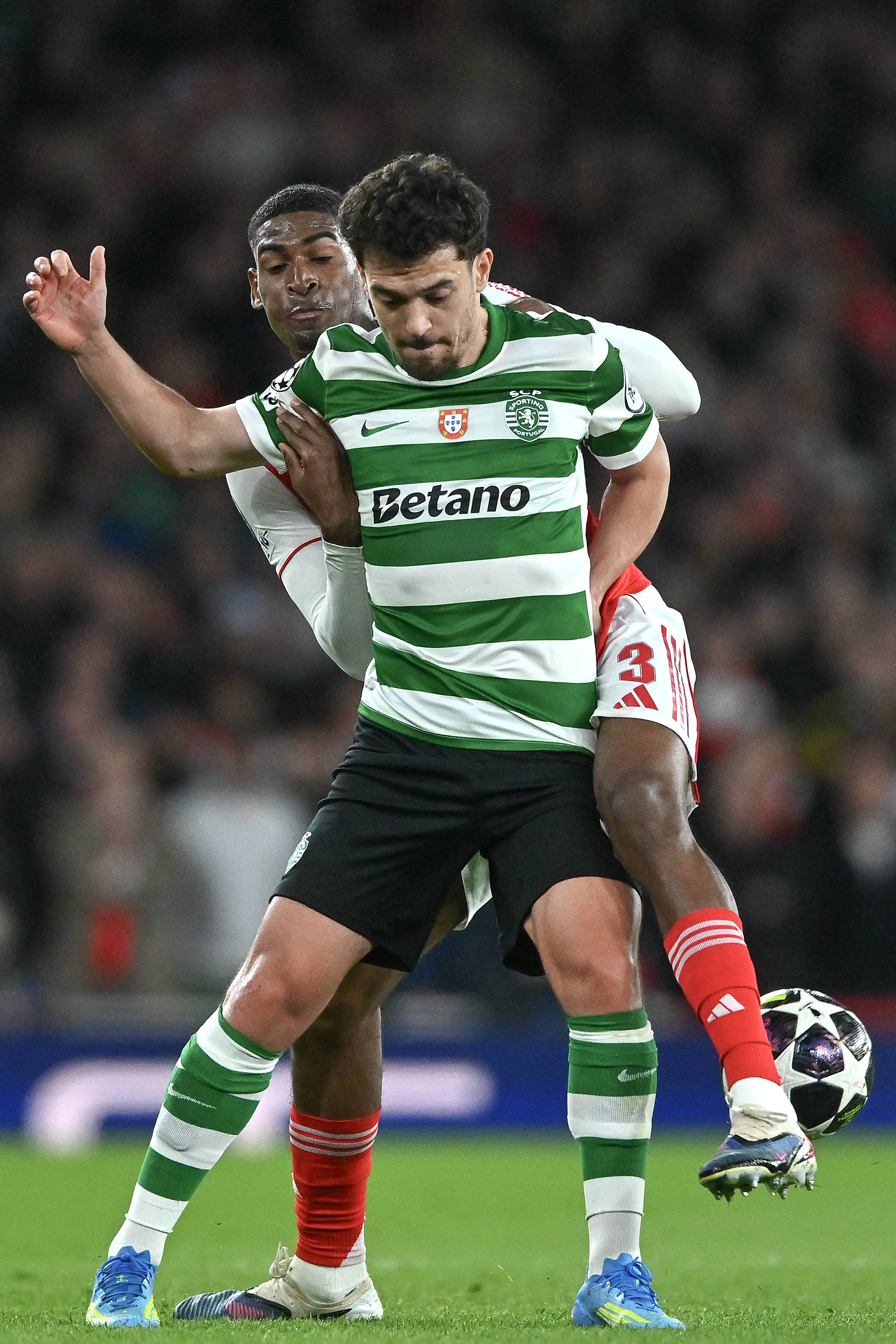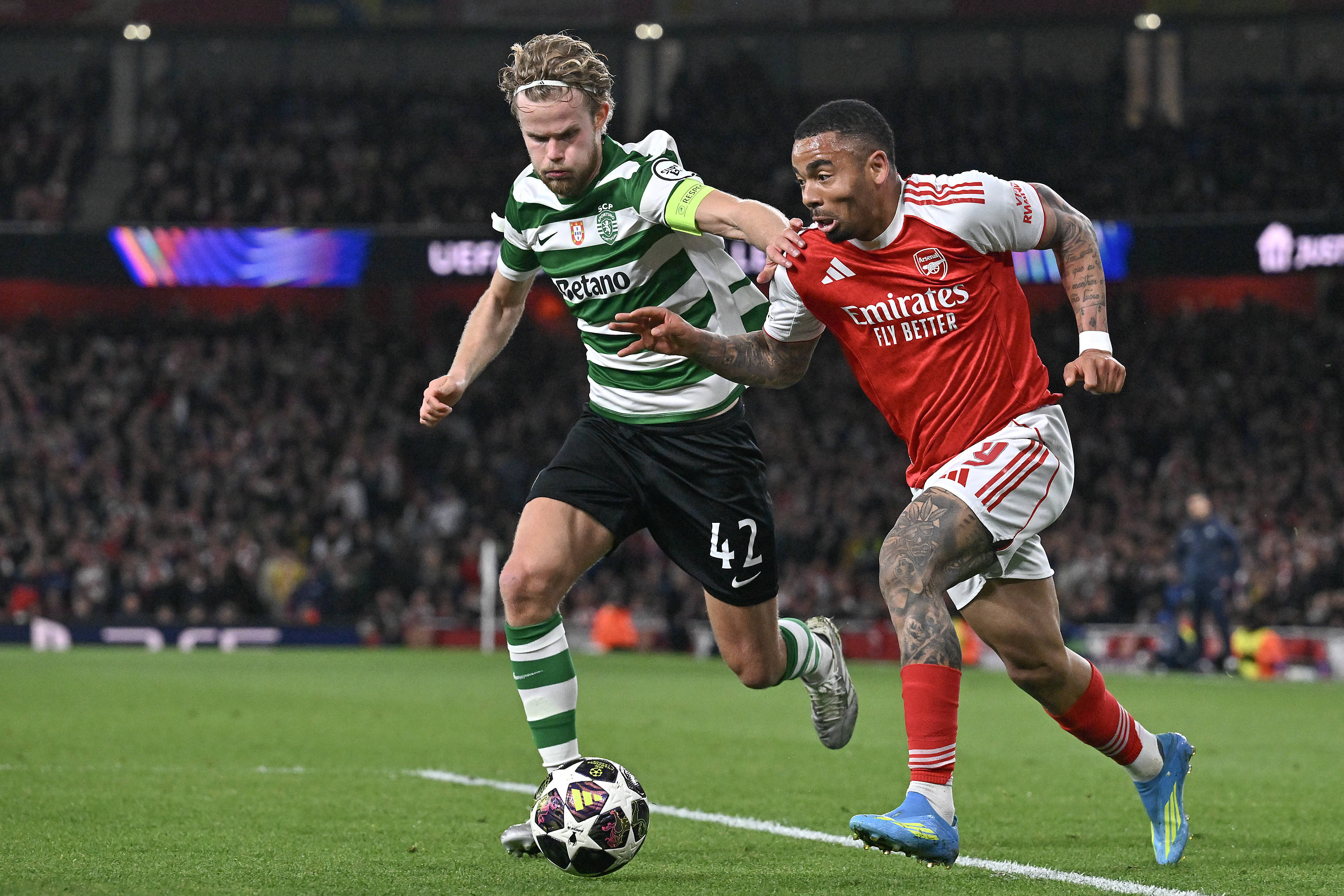 4月15日,阿森纳队球员热苏斯(右)与葡萄牙体育队球员尤尔曼拼抢。 新华社发