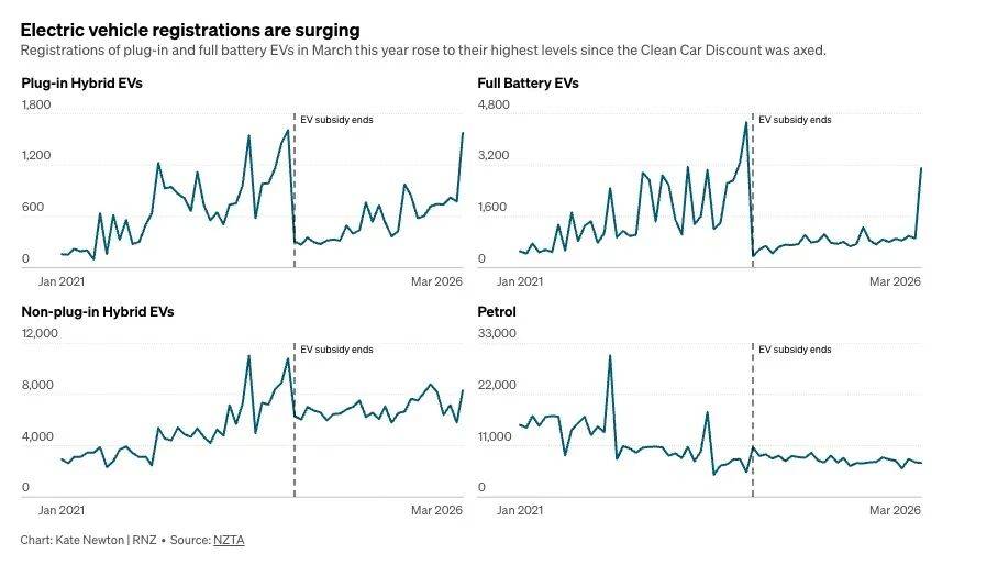 截至今年4月12日,新西兰年内新登记的纯电动车已达5137辆,较去年同期的2377辆暴涨116%。